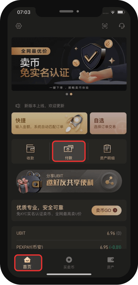 4、您的数字钱包买币成功后,进入“首页”页面,选择“付款”。
