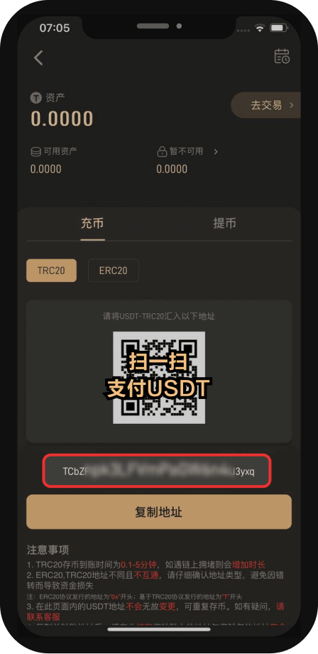 2、复制USDT付款地址或手机扫描付款二维码,去数字钱包支付。