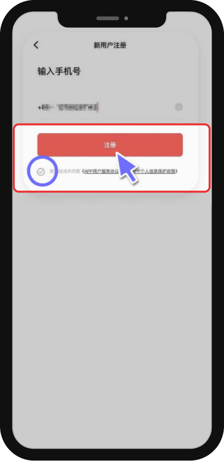 4、输入手机号,点击【注册】并勾选下方同意协议。
